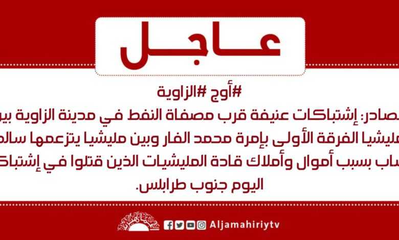عاجل // #أوج #الزاوية مصادر: إشتباكات عنيفة قرب مصفاة النفط في مدينة الزاوية بين مليشيا الفرقة الأولى بإمرة محمد الفار وبين مليشيا يتزعمها سالم قرضاب بسبب أموال وأملاك قادة المليشيات الذين قتلوا في إشتباكات اليوم جنوب طرابلس. #قناة_الجماهيرية_العظمى_قناة_كل_الجماهير