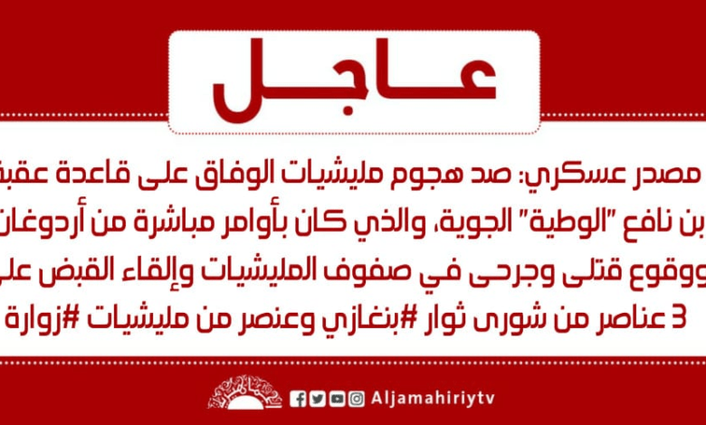 عاجل // مصدر عسكري: صد هجوم مليشيات الوفاق على قاعدة عقبة بن نافع “الوطية” الجوية، والذي كان بأوامر مباشرة من أردوغان، ووقوع قتلى وجرحى في صفوف المليشيات وإلقاء القبض على 3 عناصر من شورى ثوار #بنغازي وعنصر من مليشيات #زوارة #قناة_الجماهيرية_العظمى_قناة_كل_الجماهير