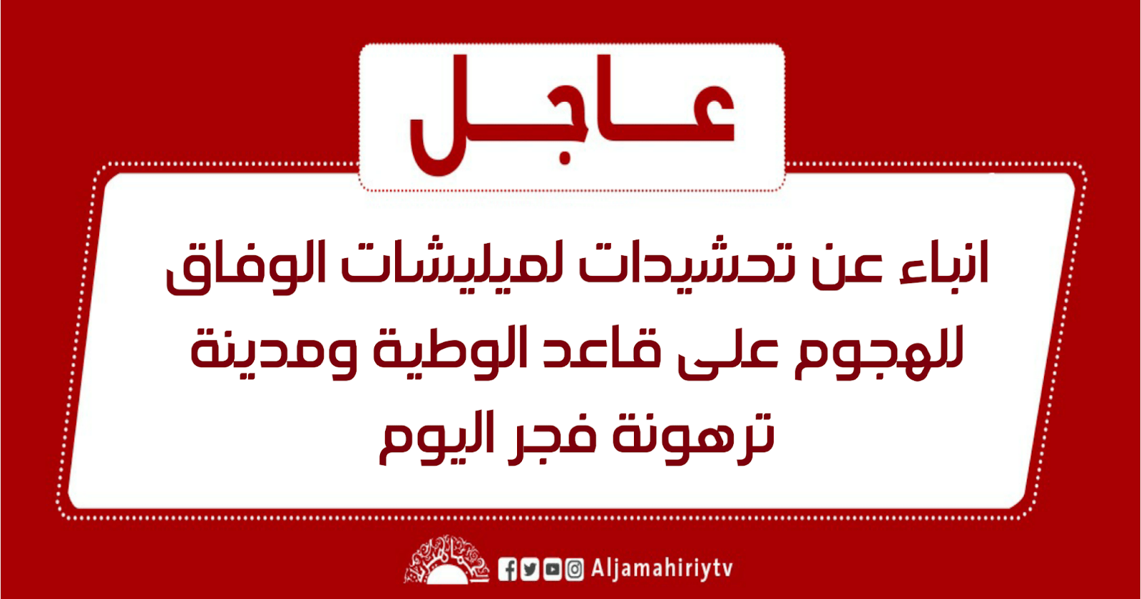 عاجل | أنباء عن تحشيدات لميليشات الوفاق للهجوم على قاعد الوطية ومدينة ترهونة فجر اليوم #قناة_الجماهيرية_العظمى_قناة_كل_الجماهير