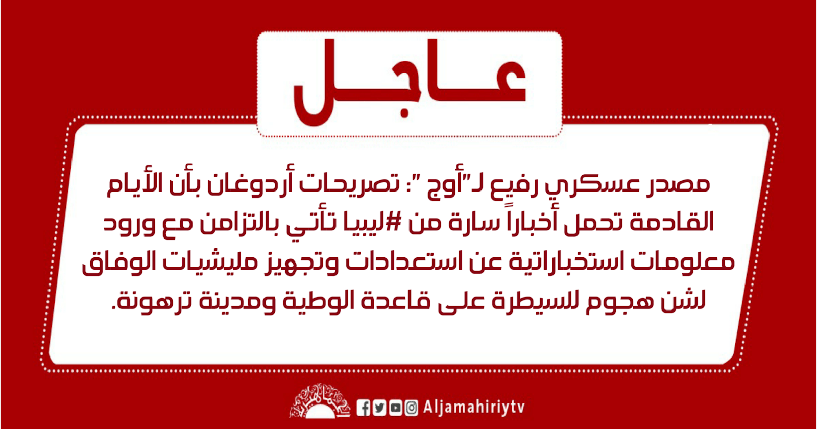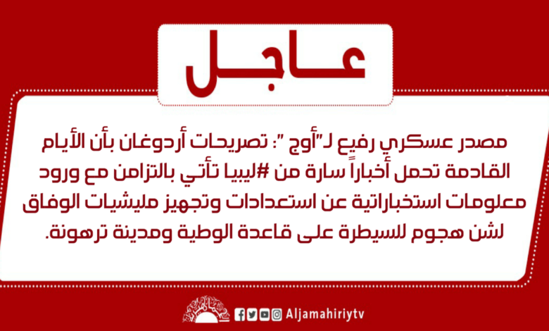 عاجل | مصدر عسكري رفيع لـ”أوج”: تصريحات أردوغان بأن الأيام القادمة تحمل أخباراً سارة من #ليبيا تأتي بالتزامن مع ورود معلومات استخباراتية عن استعدادات وتجهيز مليشيات الوفاق لشن هجوم للسيطرة على قاعدة الوطية ومدينة ترهونة. #قناة_الجماهيرية_العظمى_قناة_كل_الجماهير