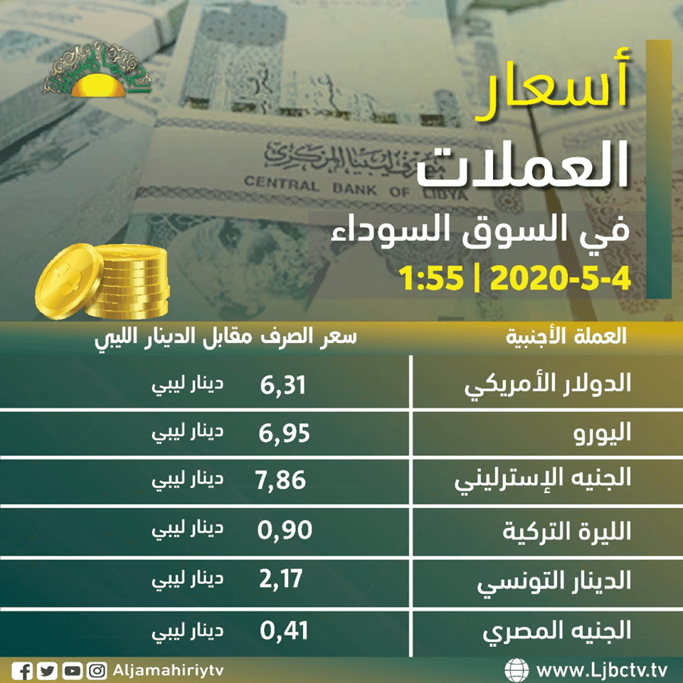 أسعار العملات الأجنبية مقابل الدينار الليبي اليوم الاثنين 04 مايو 2020 بالسوق الموازي #قناة_الجماهيرية_العظمى_قناة_كل_الجماهير