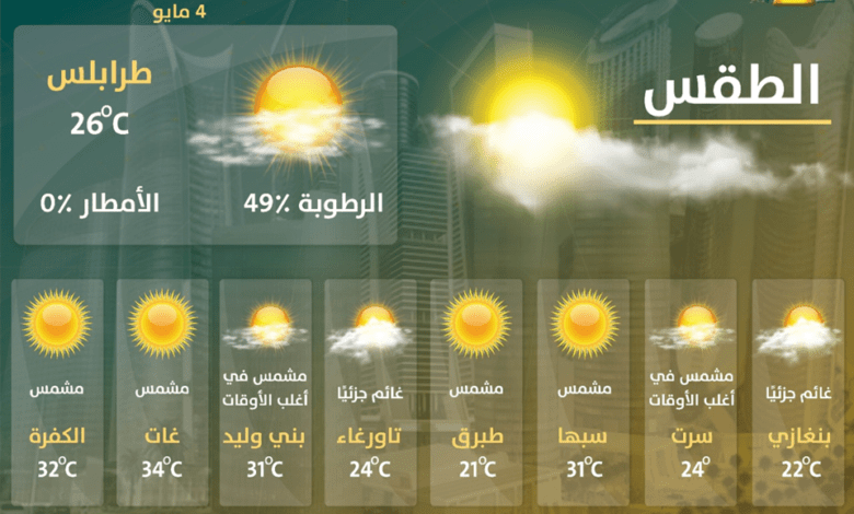 بينما تتأثر مناطق شمال غرب ليبيا  (رأس جدير حتي سرت –سهل جفارة –جبل ) بإمتداد لمنخفض صحراوي يسبب في إرتفاع ملحوط في درجات الحرارة بداية من يوم الغد  حيت نتوقع ان تتراوح يوم الأربعاء مابين (33-39) مْ