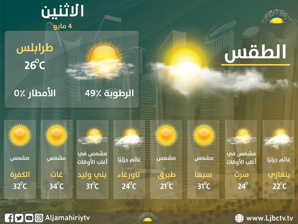 الاحوال الجوية السائدة والمتوقعة الصادرة اليوم الاثنين الموافق 2020/05/04 ف#قناة_الجماهيرية_العظمى_قناة_كل_الجماهير