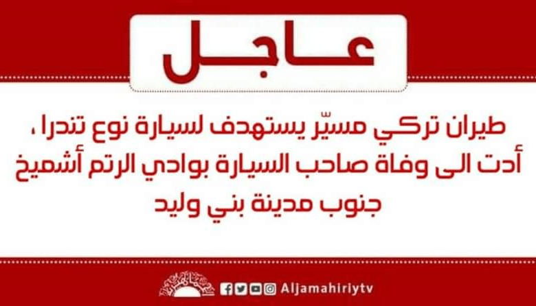 عاجل // طيران تركي مسير يستهدف سيارة نوع تندرا ، أدت إلى وفاة صاحب السيارة بوادي الرتم أشميخ جنوب مدينة بني وليد #قناة_الجماهيرية_العظمى_قناة_كل_الجماهير