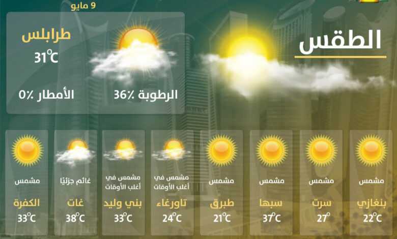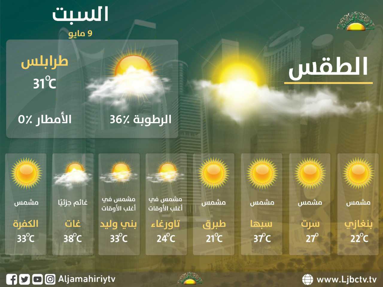 تتأثر مناطق غرب ليبيا بمنخفض جوي صحراوي متمركز جنوب شرق الجزائر يسبب في ارتفاع ملحوظ في درجات الحرارة من اليوم حيث تتراوح مابين ( 36 – 43 ) مْ ، بينما يبقى الطقس معتدل و مستقر على المناطق الشرقية هذا اليوم حيث تسجل درجات الحرارة القصوى مابين( 23 – 29 ) مْ على الساحل ومرتفعات الجبل الاخضر ومابين( 30 – 34 ) مْ على باقي المناطق ، ومن المتوقع ان تتاثر هذه المناطق بالمنخفض الجوي من يوم الغد مما يسبب في ارتفاع في درجات الحرارة على اغلب المناطق.