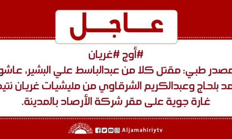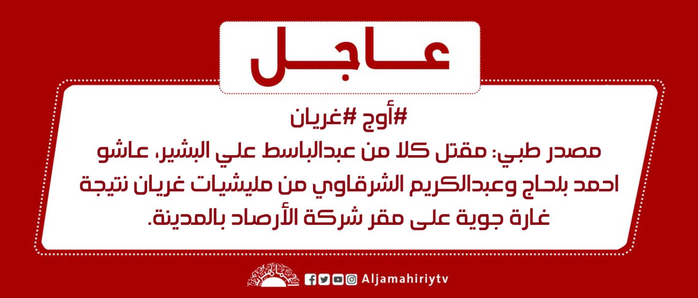 الرئيسية/عاجل/عاجل // #أوج #غريان مصدر طبي: مقتل كلا من عبدالباسط علي البشير، عاشو احمد بلحاج وعبدالكريم الشرقاوي من مليشيات غريان نتيجة غارة جوية على مقر شركة الأرصاد بالمدينة. #قناة_الجماهيرية_العظمى_قناة_كل_الجماهير عاجل عاجل // #أوج #غريان مصدر طبي: مقتل كلا من عبدالباسط علي البشير، عاشو احمد بلحاج وعبدالكريم الشرقاوي من مليشيات غريان نتيجة غارة جوية على مقر شركة الأرصاد بالمدينة. #قناة_الجماهيرية_العظمى_قناة_كل_الجماهير 2 يونيو، 2020 2 يونيو، 2020 فيسبوك تويتر بينتيريست واتساب تيلقرام ڤايبر مشاركة عبر البريد طباعة