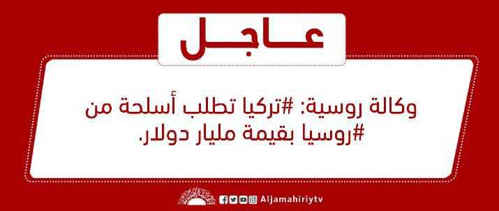 عاجل // وكالة روسية: #تركيا تطلب أسلحة من #روسيا بقيمة مليار دولار #قناة_الجماهيرية_العظمى_قناة_كل_الجماهير