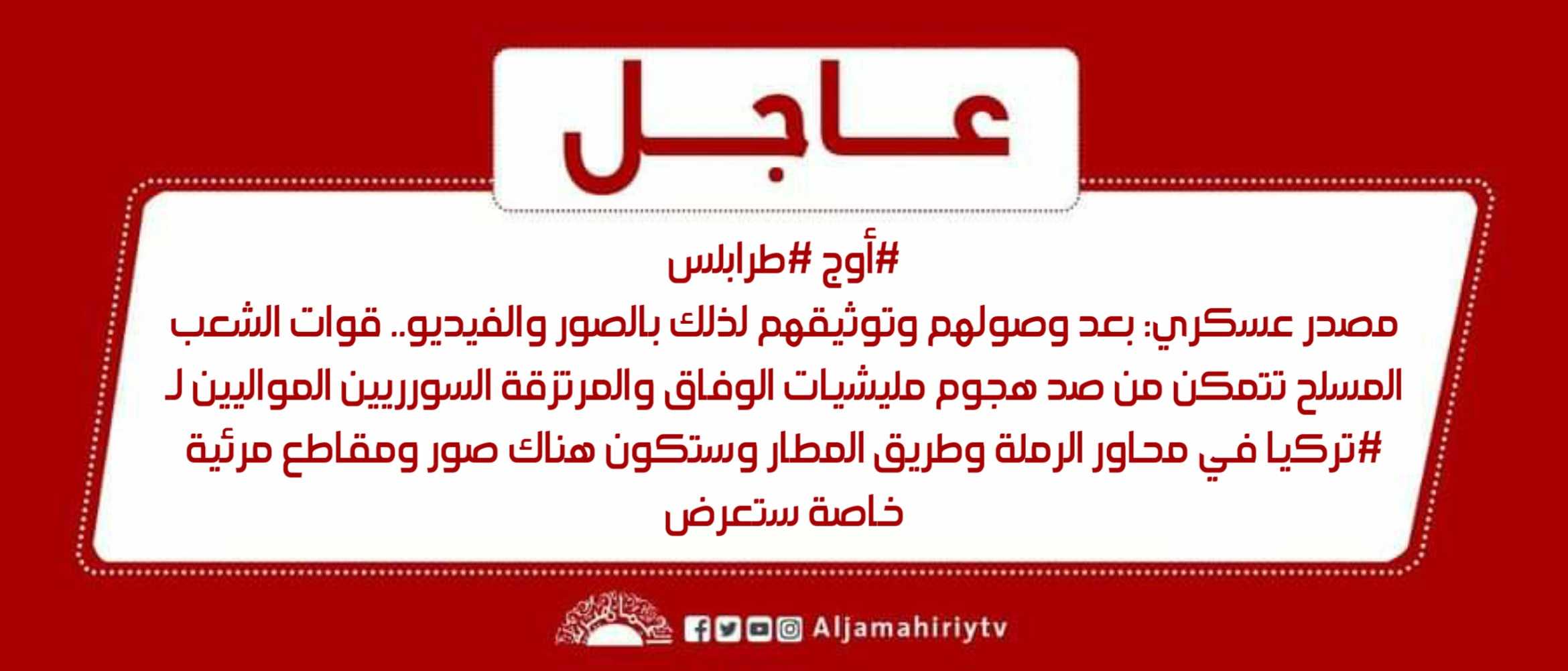 عاجل // مصدر عسكري: بعد وصولهم وتوثيقهم لذلك بالصور والفيديو.. قوات الشعب المسلح تتمكن من صد هجوم مليشيات الوفاق والمرتزقة السورريين المواليين لـ #تركيا في محاور الرملة وطريق المطار وستكون هناك صور ومقاطع مرئية خاصة ستعرض #قناة_الجماهيرية_العظمى_قناة_كل_الجماهير
