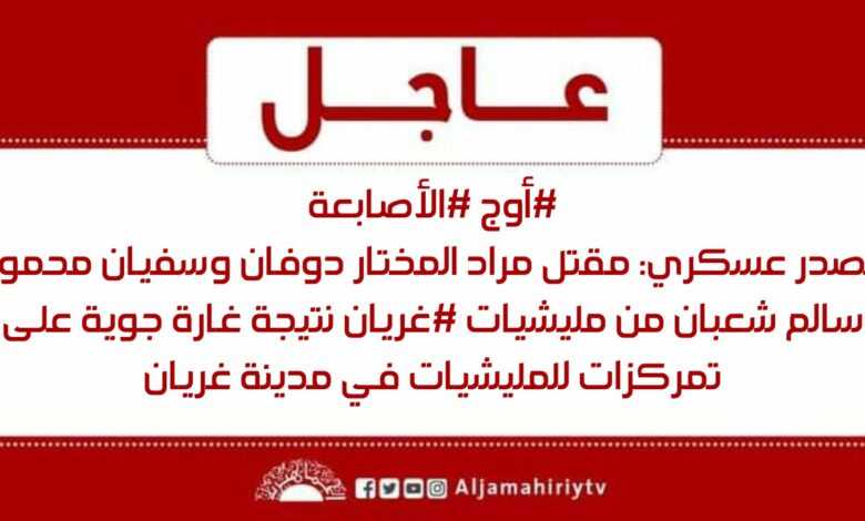عاجل // مصدر عسكري: مقتل مراد المختار دوفان وسفيان محمود سالم شعبان من مليشيات #غريان نتيجة غارة جوية على تمركزات للمليشيات في مدينة غريان #قناة_الجماهيرية_العظمى_قناة_كل_الجماهير