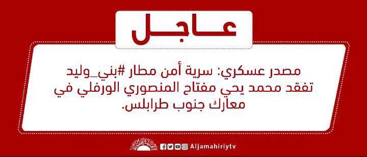 عاجل // مصدر عسكري: سرية أمن مطار #بني_وليد تفقد محمد يحي مفتاح المنصوري الورفلي في معارك جنوب طرابلس #قناة_الجماهيرية_العظمى_قناة_كل_الجماهير