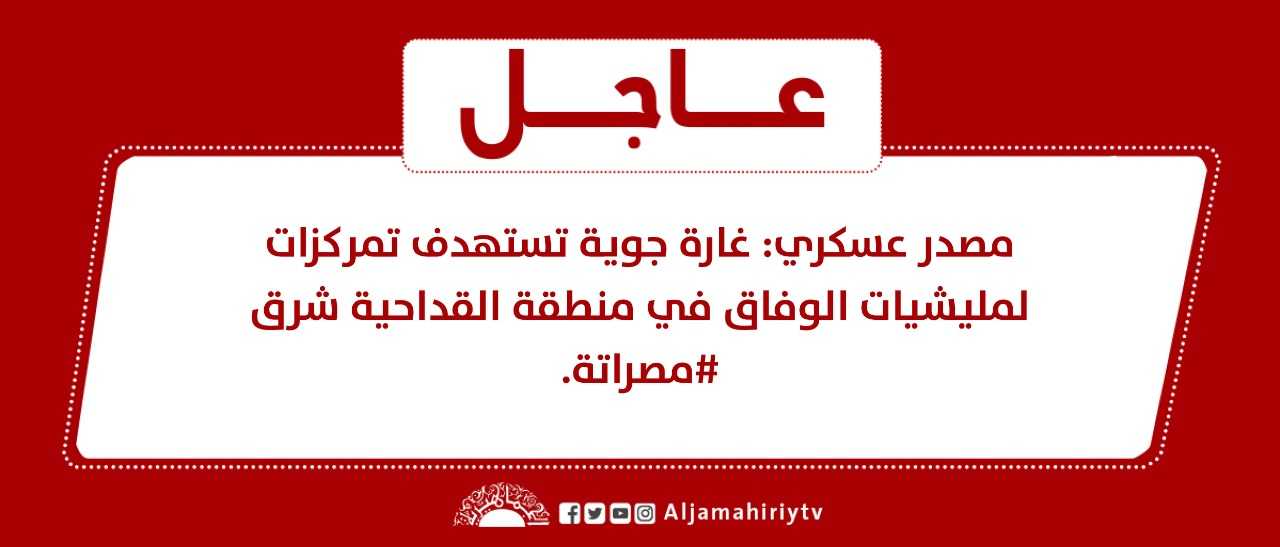 مصدر عسكري: غارة جوية تستهدف تمركزات لمليشيات الوفاق في منطقة القداحية شرق #مصراتة.