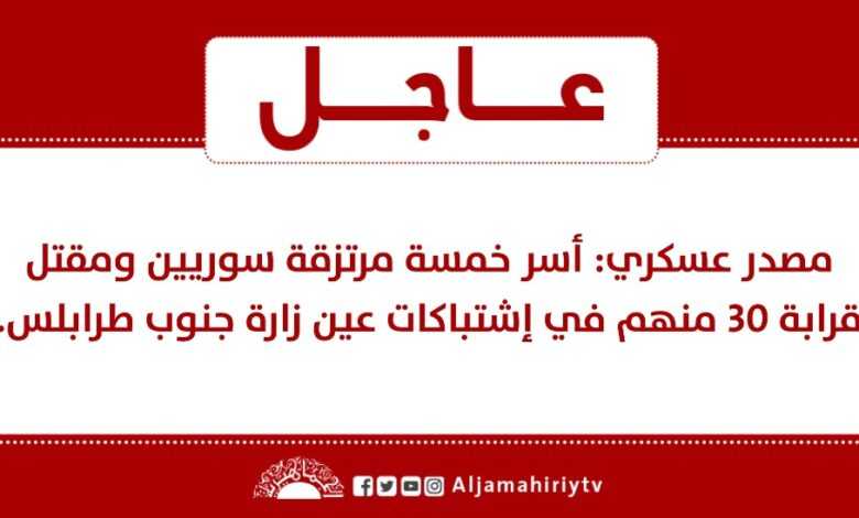 مصدر عسكري: أسر خمسة مرتزقة سوريين ومقتل قرابة 30 منهم في إشتباكات عين زارة جنوب طرابلس.