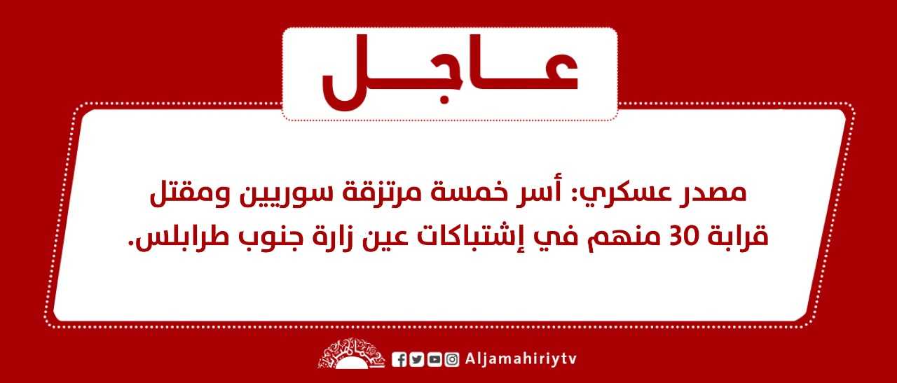 عاجل // مصدر عسكري: أسر خمسة مرتزقة سوريين ومقتل قرابة 30 منهم في إشتباكات عين زارة جنوب طرابلس #قناة_الجماهيرية_العظمى_قناة_كل_الجماهير