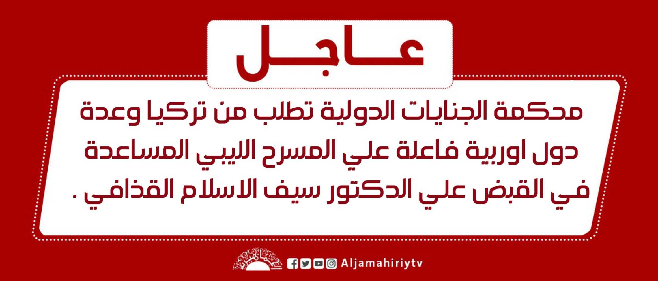 عاجل // محكمة الجنايات الدولية تطلب من تركيا وعدة دول اوربية فاعلة علي المسرح الليبي المساعدة في القبض علي الدكتور سيف الاسلام القذافي . #قناة_الجماهيرية_العظمى_قناة_كل_الجماهير