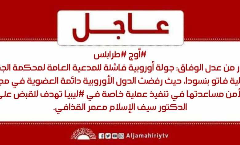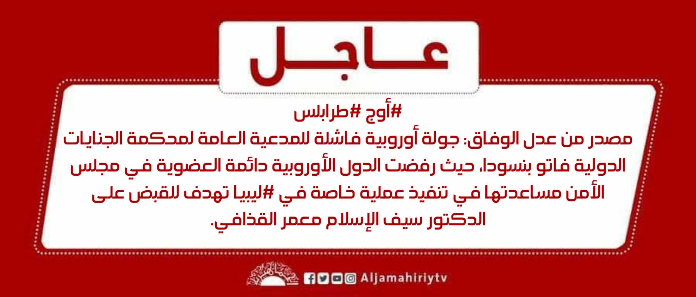 عاجل // #أوج #طرابلس مصدر من عدل الوفاق: جولة أوروبية فاشلة للمدعية العامة لمحكمة الجنايات الدولية فاتو بنسودا، حيث رفضت الدول الأوروبية دائمة العضوية في مجلس الأمن مساعدتها في تنفيذ عملية خاصة في #ليبيا تهدف للقبض على الدكتور سيف الإسلام معمر القذافي. #قناة_الجماهيرية_العظمى_قناة_كل_الجماهير