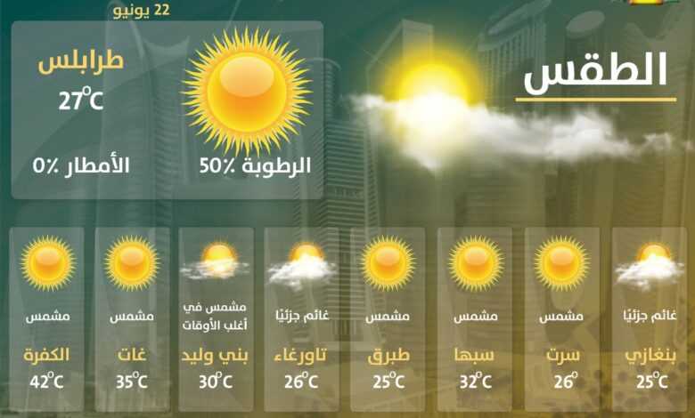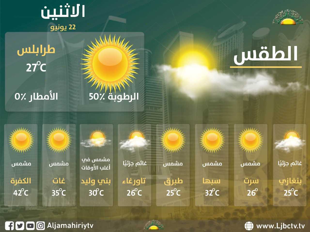 إستقرار في حالة الطقس علي اغلب مناطق ليبيا نتيجة لإمتداد مرتفع جوي مع درجات حرارة مرتفعة نسبيا على أغلب مناطق الوسط و الجنوب .