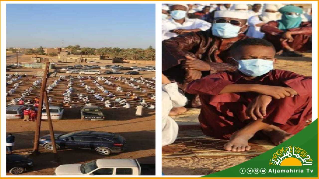 صور تظهر آداء المصلين في مدينة غات صلاة عيد الأضحى في ساحة شعبية ، وقد اتخذ المصلين إجراءات وقائية تعتمد التبعاد الاجتماعي