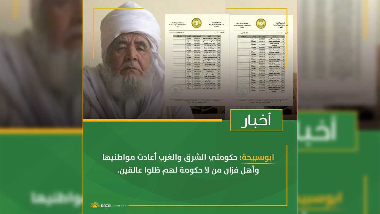 وكان أبوسبيحة، قد نشر منشورا، يوم أمس تحدث فيه عن اهمال الأسر الليبية العالقة في مصر. وخاصة أهل الجنوب،قائلا: تلقيت معلومات تفيد أن 250 أسرة من اهل فزان عالقين بمصر منعوا من الدخول برا، وقد تم ترحيل اهل الشرق بمعرفة حكومة الثني، ورحل اهل الغرب بمعرفة حكومة السراج بالتنسيق مع بلدياتهم، وظل أهل فزان لأن لا حكومة ترحلهم فبقوا هناك باستضافة أخ مصري من قبيلة القطعان حياه الله وحيا أصله الكريم وقبيلة القطعان.