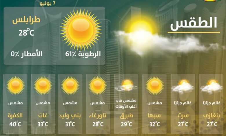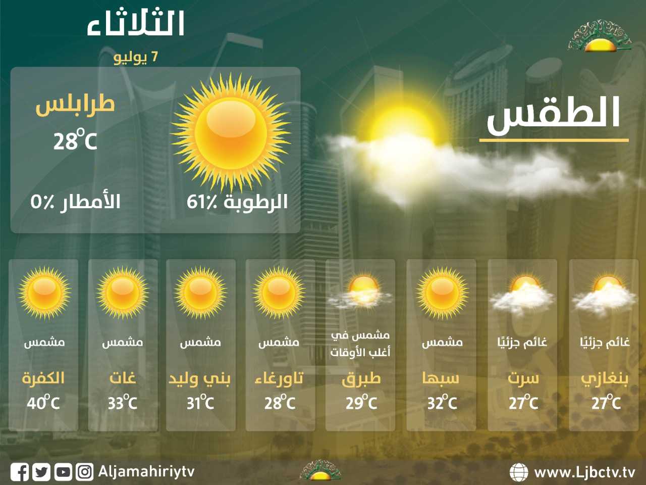 وتتراوح درجات الحرارة القصوى المتوقع تسجيلها هذا اليوم على أغلب مناطق الشمال مابين ( 25 – 33 ) مْ وتسجل ارتفاع طفيف يوم الغد ، بينما تتراوح على أغلب مناطق الوسط والجنوب مابين ( 35 – 41 ) مْ.