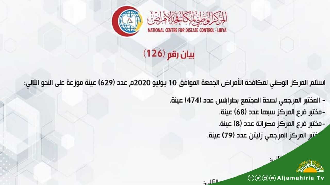 استلم المركز الوطني لمكافحة الأمراض أمس الجمعة الموافق 10 يوليو 2020م عدد (629) عينة موزعة على النحو التالي: