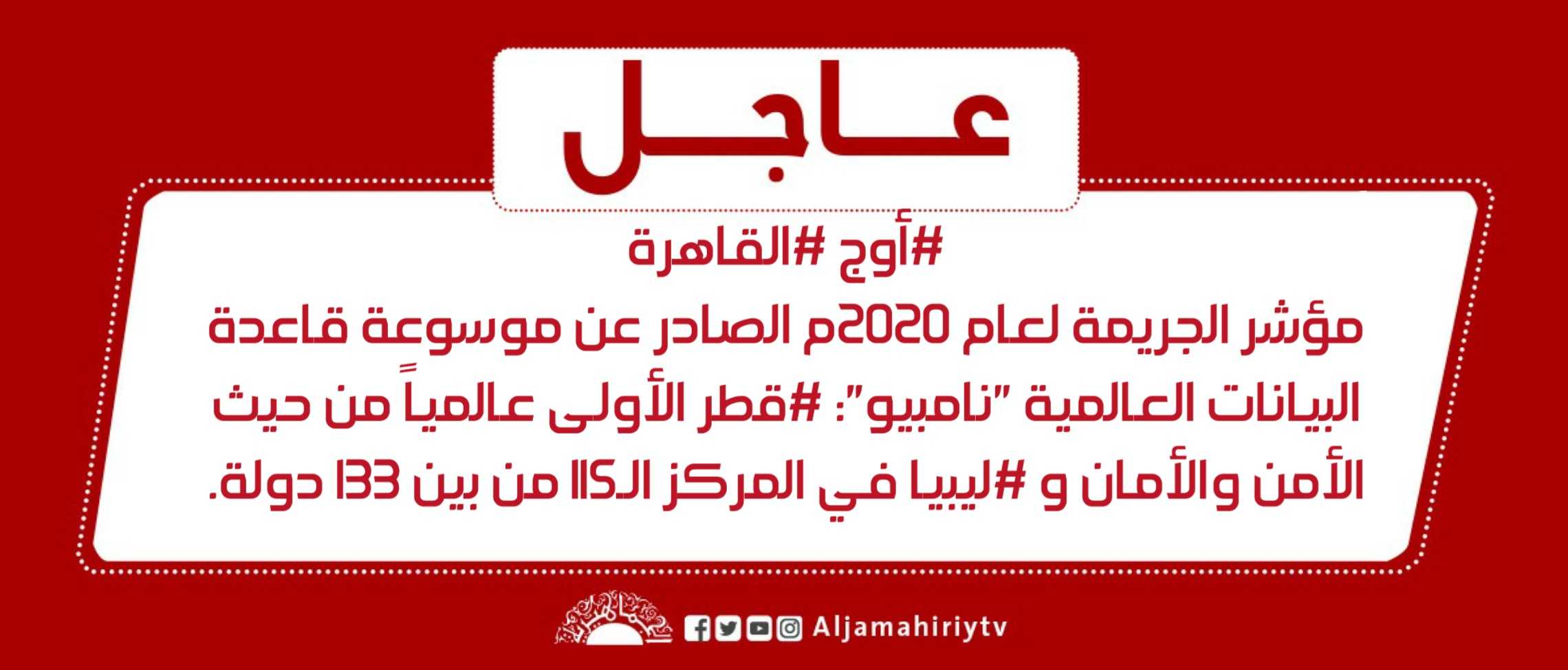 الرئيسية/محلي/عاجل #أوج #القاهرة مؤشر الجريمة لعام 2020م الصادر عن موسوعة قاعدة البيانات العالمية “نامبيو”: #قطر الأولى عالمياً من حيث الأمن والأمان و #ليبيا في المركز الـ115 من بين 133 دولة. محلي عاجل #أوج #القاهرة مؤشر الجريمة لعام 2020م الصادر عن موسوعة قاعدة البيانات العالمية “نامبيو”: #قطر الأولى عالمياً من حيث الأمن والأمان و #ليبيا في المركز الـ115 من بين 133 دولة. 11 يوليو، 2020 الوسوم#قناة_الجماهيرية 11 يوليو، 2020 فيسبوك تويتر بينتيريست واتساب تيلقرام ڤايبر مشاركة عبر البريد طباعة