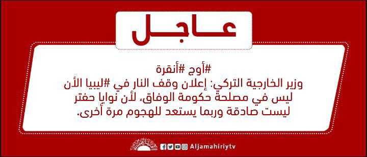 عاجل // #أوج #أنقرة وزير الخارجية التركي: إعلان وقف النار في #ليبيا الأن ليس في مصلحة حكومة الوفاق، لأن نوايا حفتر ليست صادقة وربما يستعد للهجوم مرة أخرى