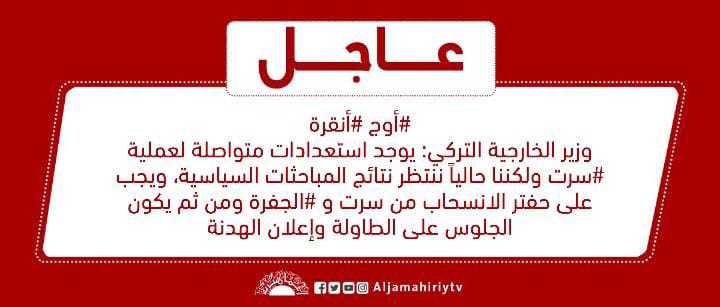 عاجل // #أوج #أنقرة وزير الخارجية التركي: يوجد استعدادات متواصلة لعملية #سرت ولكننا حالياً ننتظر نتائج المباحثات السياسية، ويجب على حفتر الانسحاب من سرت و #الجفرة ومن ثم يكون الجلوس على الطاولة وإعلان الهدنة