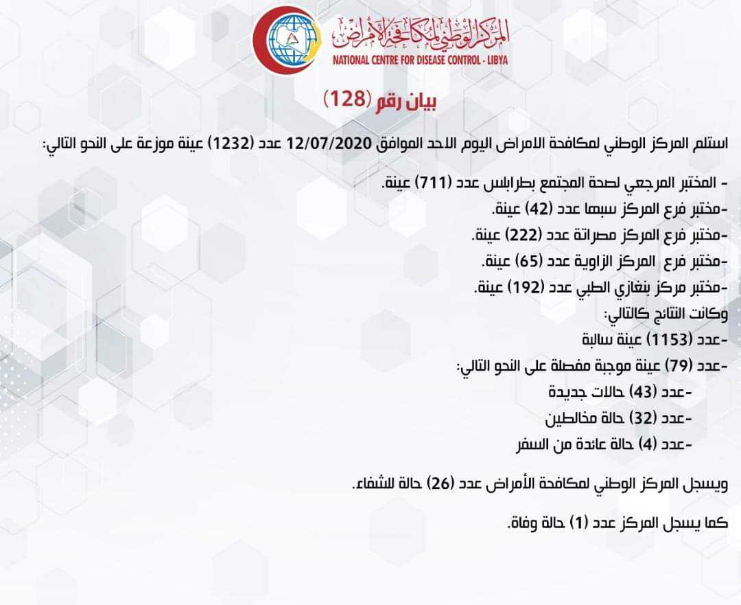 عاجل // بيان المركز الوطني لمكافحة الأمراض – 128 / 13 يوليو 2020م