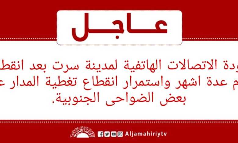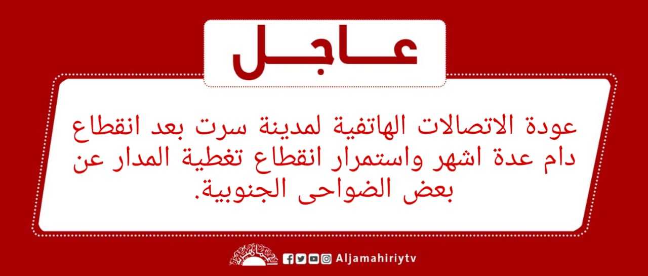 عاجل // عودة الاتصالات الهاتفية لمدينة سرت بعد انقطاع دام عدة اشهر واستمرار انقطاع تغطية المدار عن بعض الضواحى الجنوبية