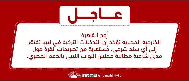 الخارجية المصرية تؤكد أن التدخلات التركية في ليبيا تفتقر إلى أي سند شرعي، مُستغربة من تصريحات أنقرة حول مدى شرعية مطالبة مجلس النواب الليبي بالدعم المصري.