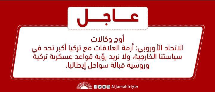عاجل // أوج وكالات /الاتحاد الأوروبي: أزمة العلاقات مع تركيا أكبر تحد في سياستنا الخارجية، ولا نريد رؤية قواعد عسكرية تركية وروسية قبالة سواحل إيطاليا
