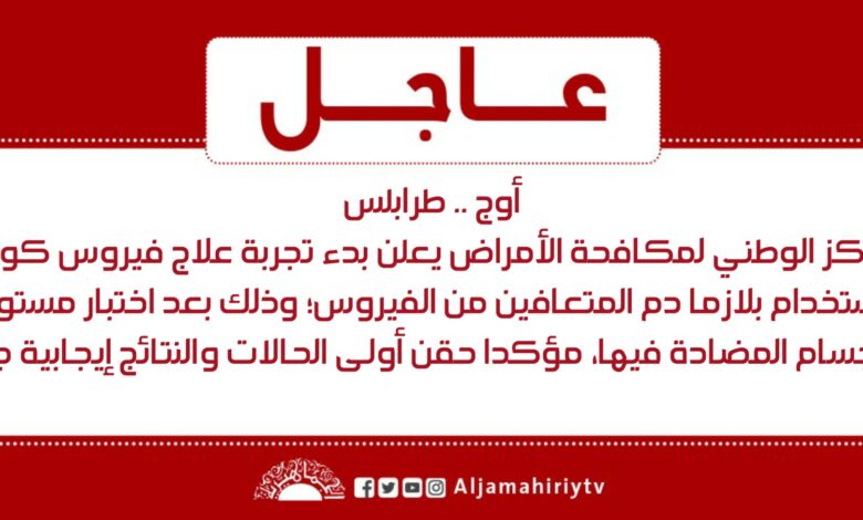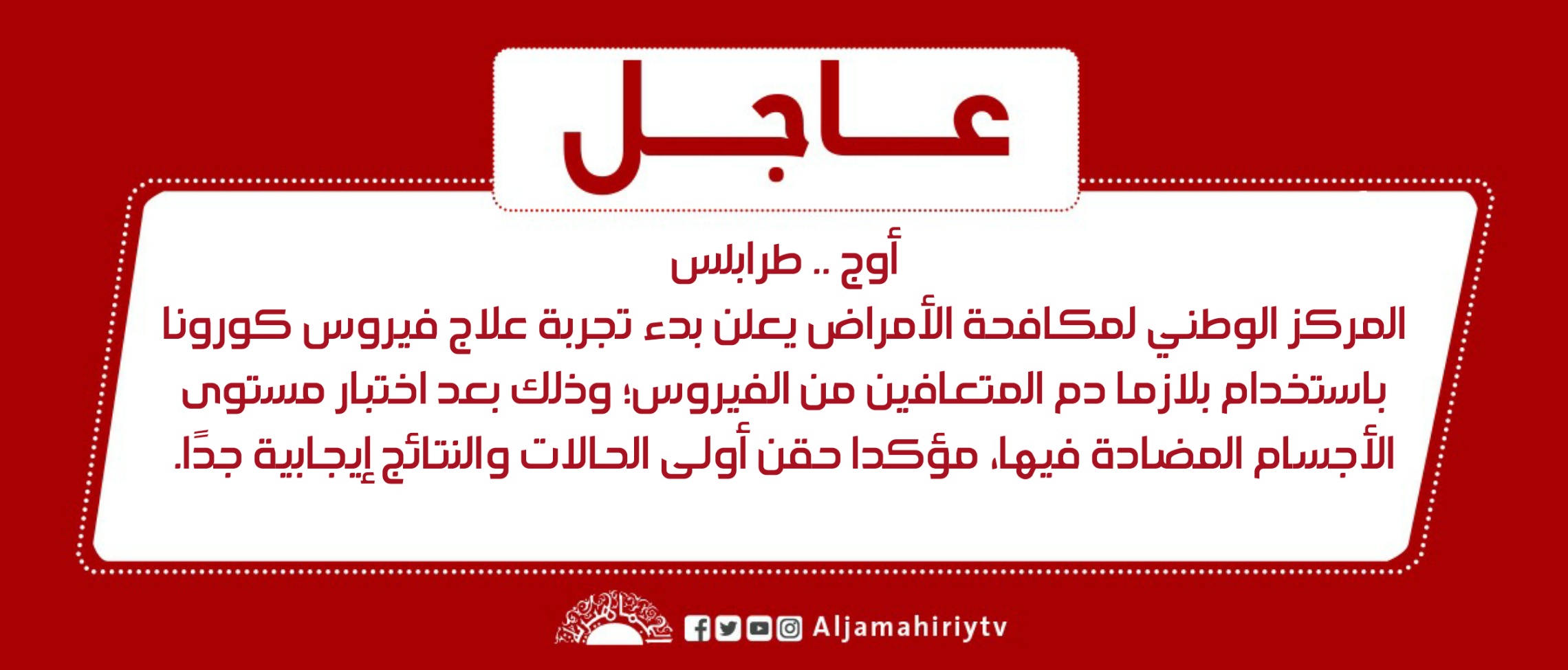 الرئيسية/محلي/عاجل // أوج .. طرابلس المركز الوطني لمكافحة الأمراض يعلن بدء تجربة علاج فيروس كورونا باستخدام بلازما دم المتعافين من الفيروس؛ وذلك بعد اختبار مستوى الأجسام المضادة فيها، مؤكدا حقن أولى الحالات والنتائج إيجابية جدًا. محلي عاجل // أوج .. طرابلس المركز الوطني لمكافحة الأمراض يعلن بدء تجربة علاج فيروس كورونا باستخدام بلازما دم المتعافين من الفيروس؛ وذلك بعد اختبار مستوى الأجسام المضادة فيها، مؤكدا حقن أولى الحالات والنتائج إيجابية جدًا. 18 يوليو، 2020 الوسوم#قناة_الجماهيرية 18 يوليو، 2020 فيسبوك تويتر بينتيريست واتساب تيلقرام ڤايبر مشاركة عبر البريد طباعة