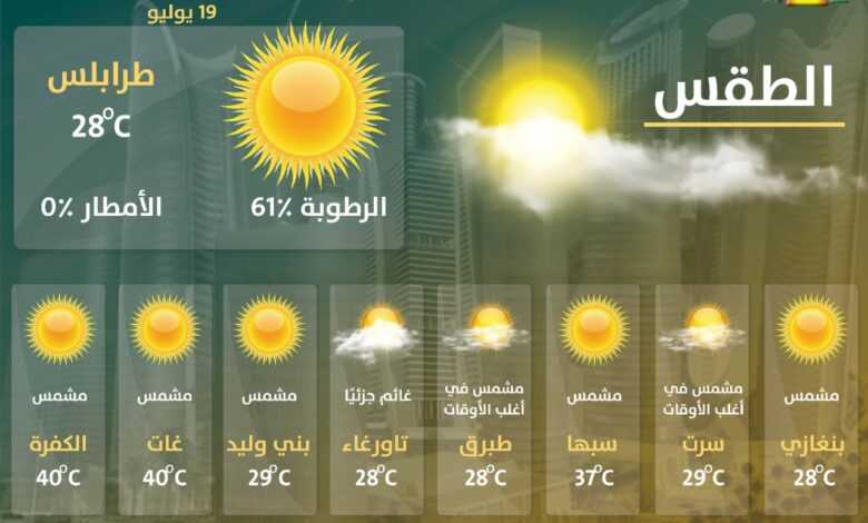 وأشار المركز إلى أن مناطق الخليج و سهل بنغازي حتى امساعد و جالو و مرادة ستكون السماء بها صافية إلى قليلة السحب مع رطوبة عالية على المناطق الساحلية، والرياح شمالية غربية خفيفة إلى معتدلة، وتتراوح درجات الحرارة القصوى بين 26 و33 درجة مئوية على المناطق الساحلية والجبل الأخضر، وتتراوح بين 36 و39 درجة مئوية على جالو والجغبوب.