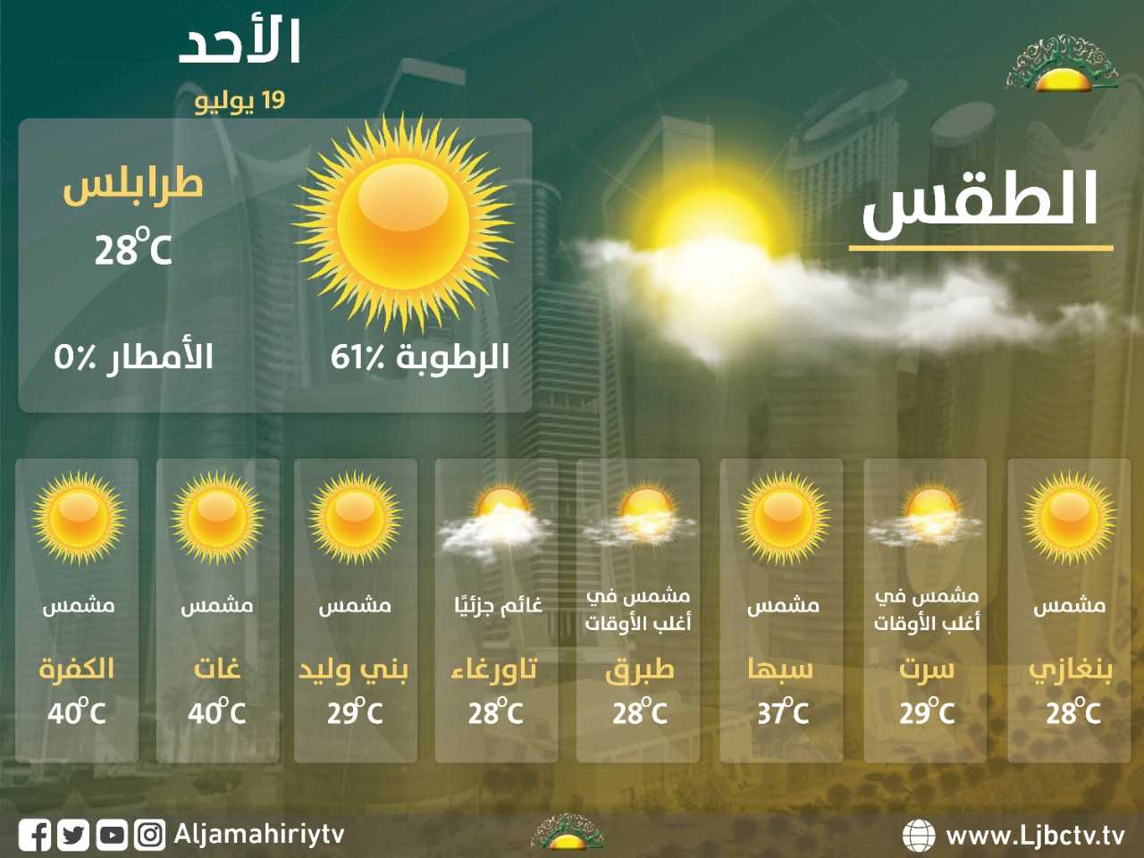 ولفت المركز إلى أن مناطق الجفرة و سبها و غات و غدامس و الحمادة ستكون السماء صافية إلى قليلة السحب، والرياح شمالية شرقية إلى شرقية خفيفة إلى معتدلة على غدامس والحمادة والجفرة، بينما تكون جنوبية غربية فجنوبية شرقية خفيفة إلى معتدلة السرعة على بقية المناطق. وتتراوح درجات الحرارة القصوى بين 39 و43 مئوية، ولا تتجاوز 35 مئوية على الحمادة.