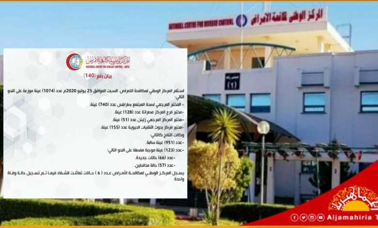 يسجل المركز الوطني لمكافحة الأمراض عدد ( 6 ) حالات تماثلت للشفاء فيما تم تسجيل حالة وفاة واحدة