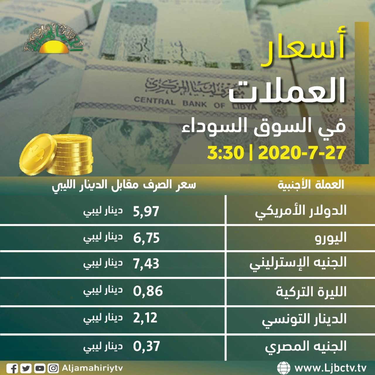 أسعار صرف الدولار و العملات الأجنبية مقابل الدينار الليبي اليوم الأثنين 27 يوليو 2020 وفقا للأرقام الواردة عن تعاملات السوق السوداء ..