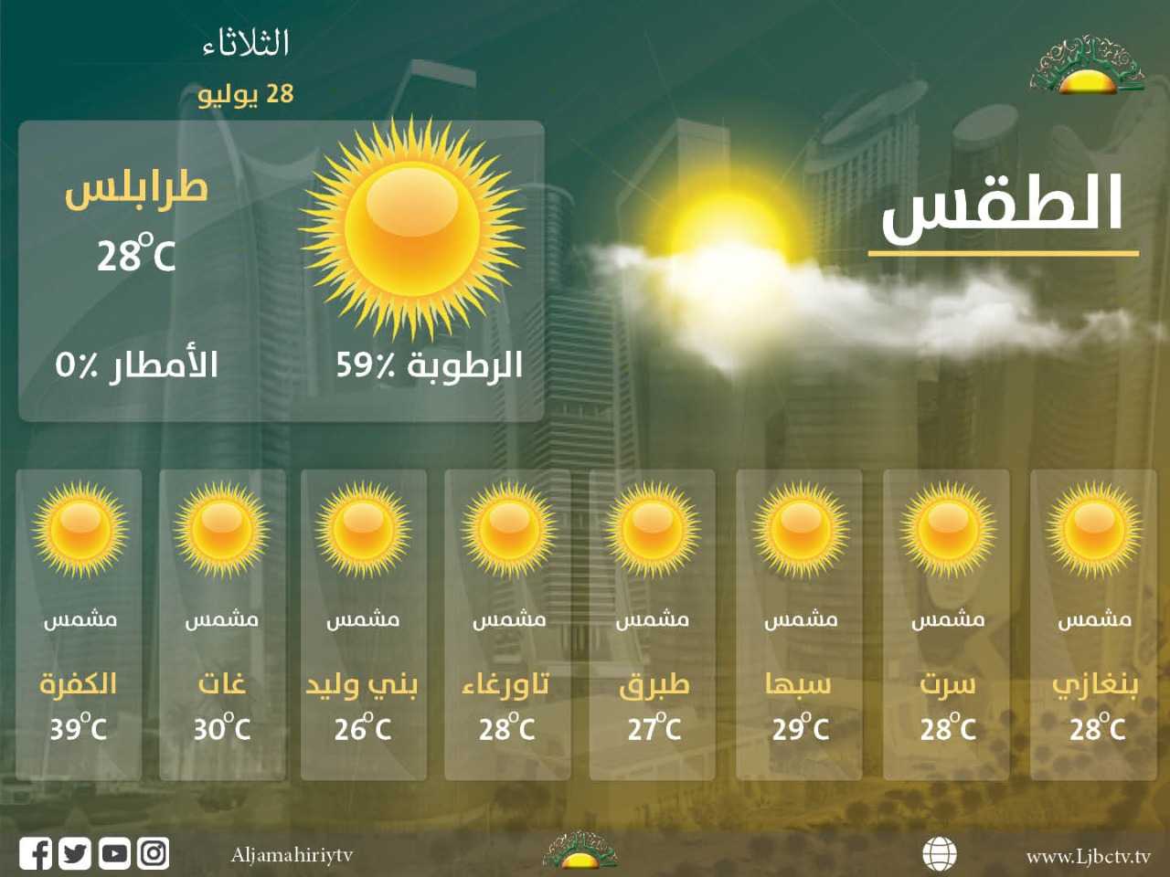 الحالة الجوية السائدة والمتوقعة الصادرة اليوم الثلاثاء بتاريخ 2020/7/28 ف