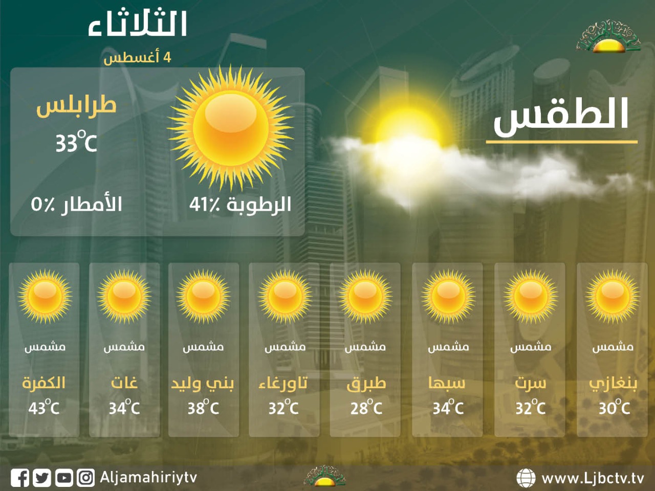 الحالة الجوية السائدة والمتوقعة الصادرة اليوم الثلاثاء بتاريخ 2020/8/4 ف