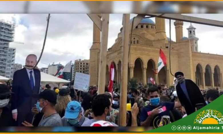أوج بيروت/ متظاهرون لبنانيون يعلقون صورا لأمين عام حزب الله حسن نصر الله، ورئيس مجلس النواب نبيه بيري ويحملوهما مسؤولية تفجيرات بيروت