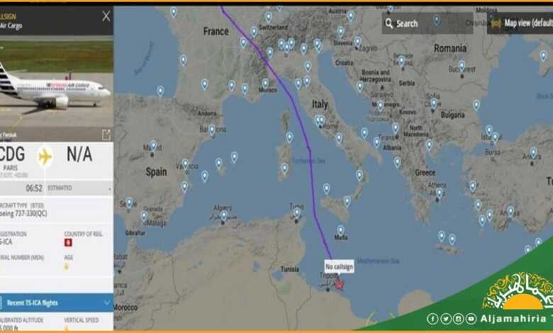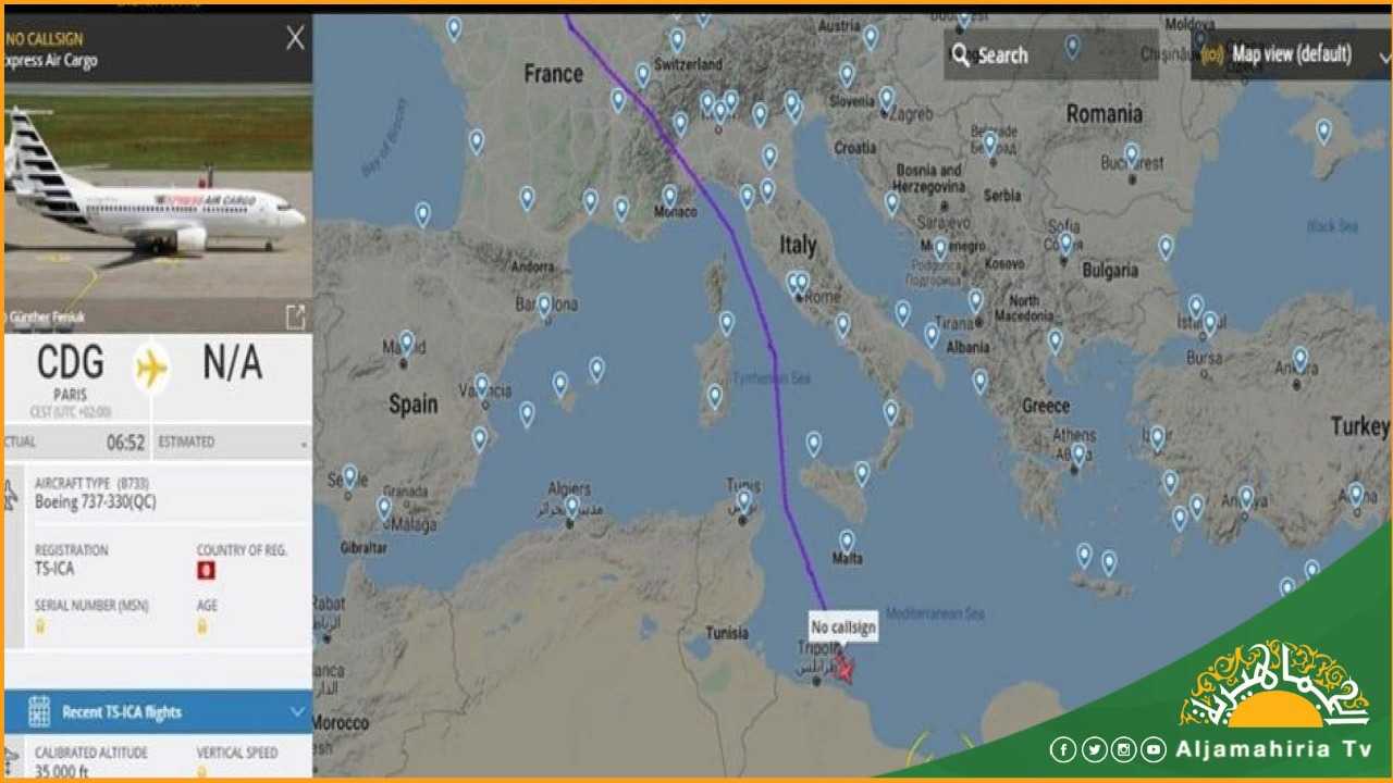 حسابات رصد حركة الطيران: طائرة شحن جوية تونسية من طراز ” 737-330QC) TS-ICA en)”، أقلعت من العاصمة الفرنسية باريس، في طريقها إلى مصراتة
