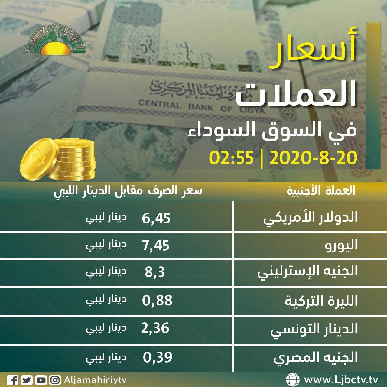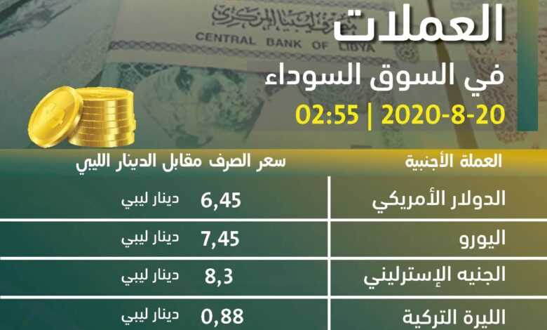 أسعار العملات الأجنبية مقابل الدينار الليبي اليوم الخميس 20 /8/ 2020 بالسوق الموازي