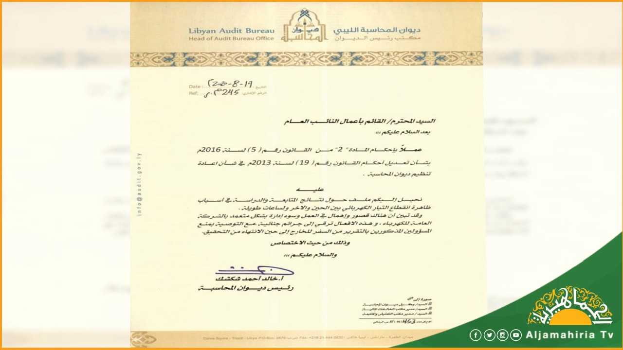 أكد ديوان المحاسبة الليبي، وجود قصور وإهمال في العمل وسوء إدارة متعمد، بالشركة العامة للكهرباء، يرقى إلى كونه جرائم جنائية، هى السبب وراء انقطاع الكهرباء لساعات طويلة.
