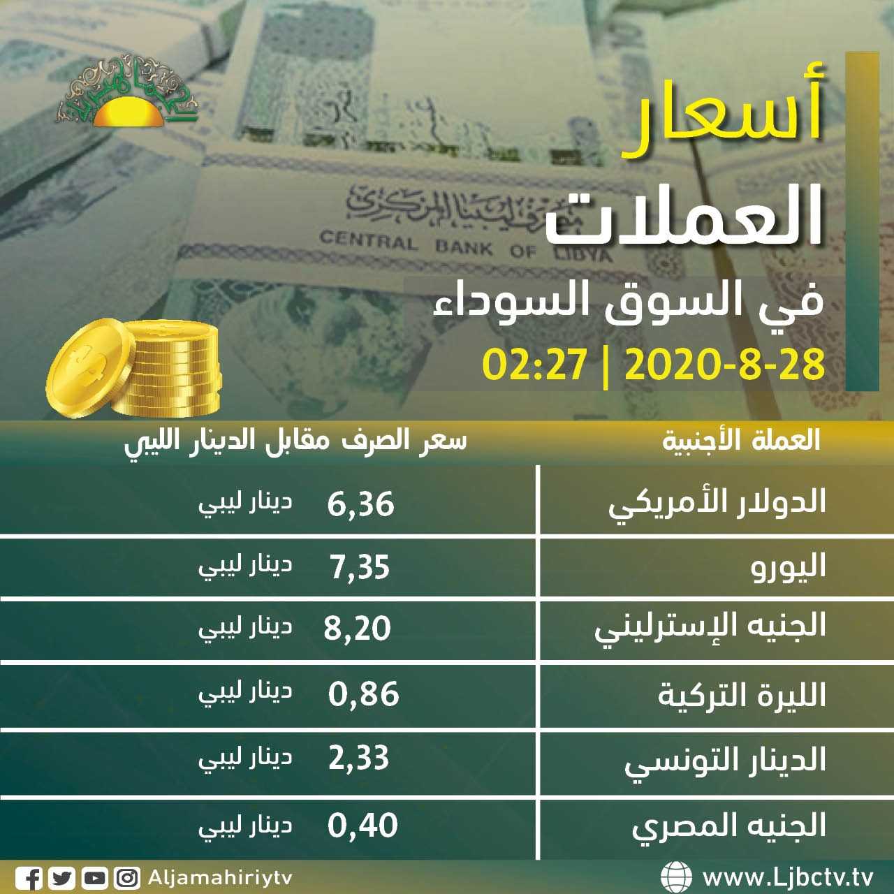 بالارقـام.. أسعار العملات الأجنبية مقابل الدينار الليبي اليوم الجمعة 28 اغسطس 2020 بالسوق الموازي