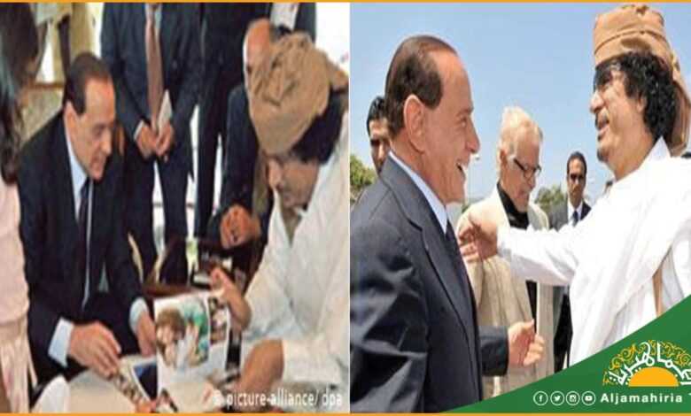 وأعلن برلوسكوني، في مستهل زيارته لليبيا أنذاك، ولقائه القائد الشهيد، أن روما ستدفع لليبيا نحو 5 مليارات دولار على مدى السنوات ال25 المقبلة، تعويضا عن الفترة الاستعمارية. وقال إنه اعتراف أخلاقي بالأضرار التي لحقت بليبيا من قبل إيطاليا طوال فترة الحكم الاستعماري وكرر آسفه وآسف الشعب الإيطالي عما حدث لليبيين.