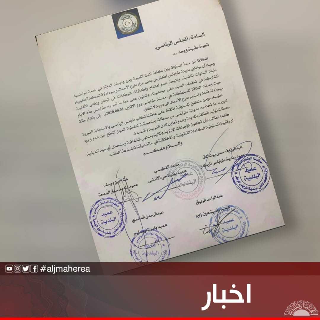 أصدر عمداء بلديات طرابلس بيانا هاما، طالبوا فيه حكومة السراج غير الشرعية، بتوريد محطات توليد كهربائية استعجالية خاصة بمدينة طرابلس فقط.