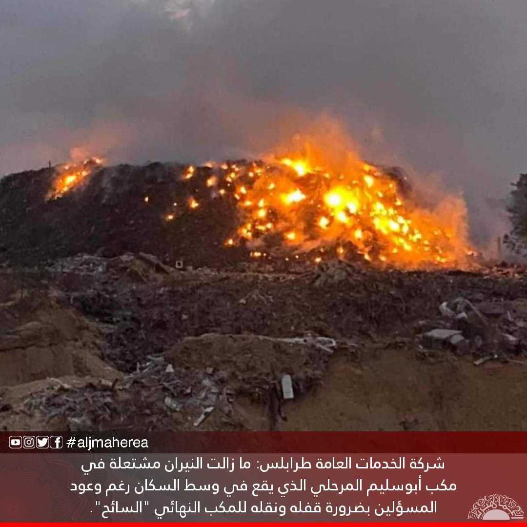 شركة الخدمات العامة طرابلس: ما زالت النيران مشتعلة في مكب أبوسليم المرحلي الذي يقع في وسط السكان رغم وعود المسؤلين بضرورة قفله ونقله للمكب النهائي “السائح”.
