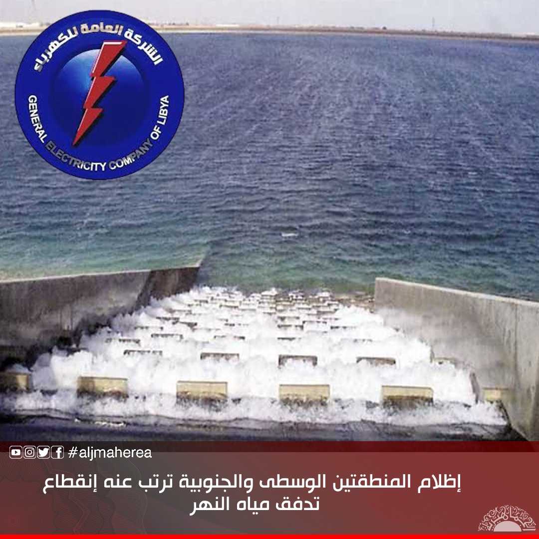 إستمرار إنقطاع مياه النهر الصناعي العظيم بعد حادث الإطفاء التام للشبكة الكهربائبة بالمنطقتين الوسطى والجنوبية الثلاثاء الماضي مما أدى إلى توقف ضخ المياه.