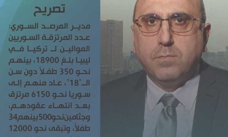 مدير المرصد السوري رامي عبدالرحمن: عدد المرتزقة السوريين الموالين لـ تركيا في ليبيا بلغ 18900، بينهم نحو 350 طفلاً دون سن الـ”18″، عاد منهم إلى سوريا نحو 6150 مرتزق بعد انتهاء عقودهم، وجثامين نحو 500 بينهم 34 طفلاً، وتبقى نحو 12000 مرتزق منهم في ليبيا