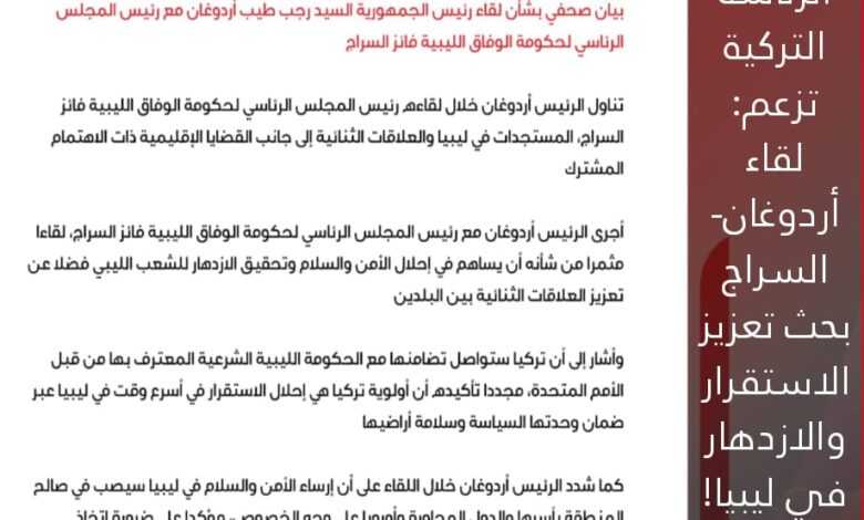 الرئاسة التركية تزعم: لقاء أردوغان- السراج بحث تعزيز الاستقرار والازدهار في ليبيا!