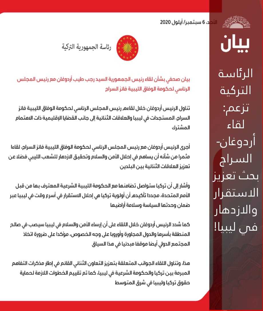 أصدرت الرئاسة التركية، بيانا بشأن لقاء أردوغان وفايز السراج رئيس الحكومة غير الشرعية. أعلنت فيه تضامن أنقرة مع الحكومة غير الشرعية التي يرأسها السراج. وأكدت مجددا على ان أولوية تركيا وليبيا، إحلال السلام في أسرع وقت في ليبيا من خلال الحفاظ على حدتها السياسية وسلامة أراضيها.